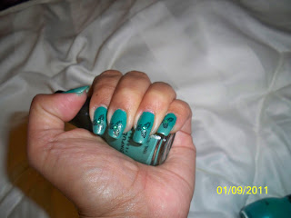 So these are the last designs for this month. I like the images but not the colors I choose. I should have used a different color to stamp the images. On with the colors I used, as my base I used Aquamarine by NK Nail Enamel and special Konad polish in blue. The image plate is by Bundle Monster 11. I applied rhinestomes on the flowers that are hardly visible. I might try it again tomorrow.....not sure though.